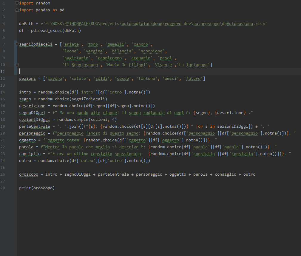 Each episode had different sections, and one of these sections was the “Auto-Horoscope”, the first of my contributions to the project. I basically created a database selecting funny jokes, sentences, aphorisms and the like that I found on the internet, together with ridiculous descriptions of the different zodiac signs, and then I created a very simple python script that, at each time, randomly selected some of those sentences and used them to fill a general template text, therefore creating each time a different funny horoscope in the form of a long string.
