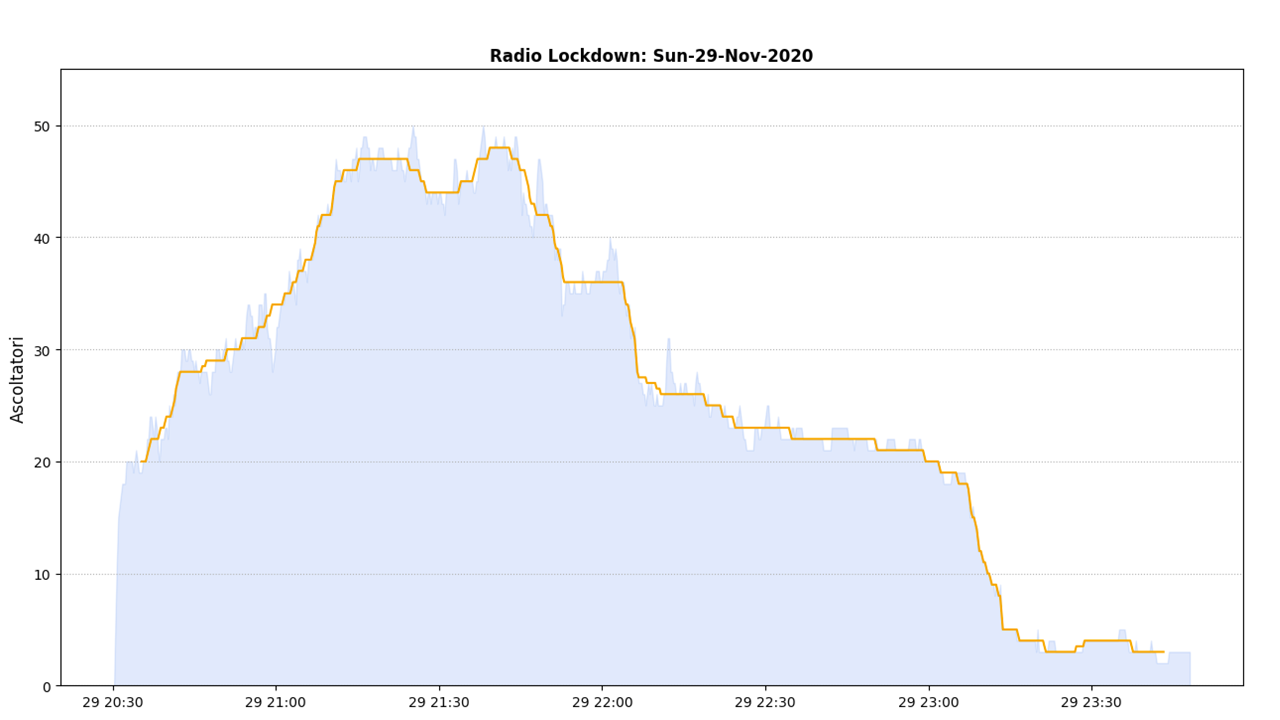 Therefore I created a python script that used the BeautifulSoup package to scrape our dedicated IceCast2 URL every 15 seconds, storing the number of current listeners in an excel database that I handled with pandas. After that I applied a moving average smoothed over a 10 minutes interval so to get more meaningful results.